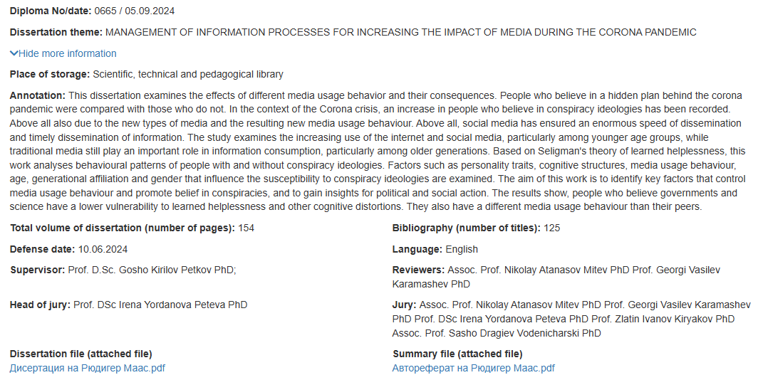 Nun hat meine Bibliothekarin nach langer Suche also doch noch die Doktorarbeit des wegen seiner Titelführungen und unklaren Ausbildungsstationen in Kritik geratenen ZDF-„Generationenforschers“ Rüdiger Maas aus Augsburg gefunden. Hier (Klick rechts oben auf „EN“) kann das 154 Seiten starke Werk aus dem Jahr 2024 auf Englisch und in einer kürzeren bulgarischen Fassung heruntergeladen werden.