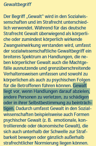 Die Studienautorinnen gehen von einem Hausmacher-Begriff von „Gewalt“ aus. Dieser wird auf S. 8 der Studie eingeführt (und auf S. 40 wortgleich wiederholt). Googelt man die Formulierungen, stellt man fest, dass genau diese Begrifflichkeit vorher nirgendwo verwendet wurde. Die Definitionen wurden ohne Fußnoten bzw. ohne Literaturquellen, also ohne Bezug auf bisherige Definitionsarbeit präsentiert. Das ist keine Wissenschaft, das ist Beliebigkeit: