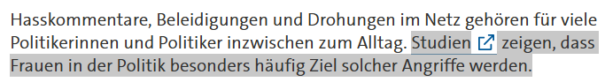 Entscheidend ist aber: Dass „Frauen in der Politik besonders häufig Ziel solcher Angriffe werden“, wie die Tagesschau behauptet, steht in der 35-seitigen Studie an keiner Stelle.