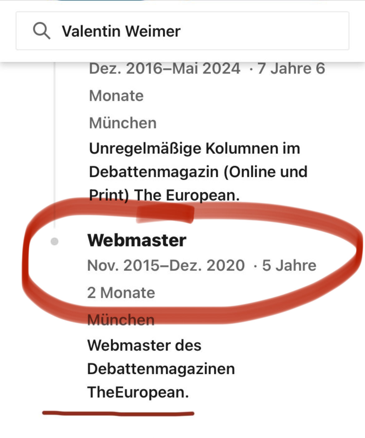Auch der Sohnemann hat diese berufliche Station aus seinem LinkedIn-Profil heute Nacht gelöscht. In der Familie Weimer läuft offenbar die ganz große Vertuschungsaktion dieses einzigartigen familiären Betrugsskandals. Hier besteht ganz eindeutig Verdunkelungsgefahr. Die Behörden müssen unverzüglich handeln.