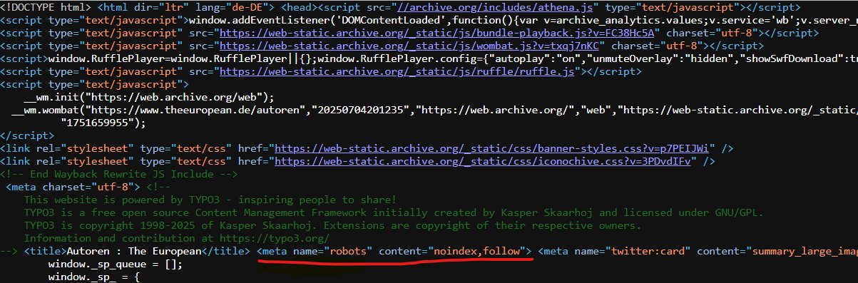 Der „noindex“-Tag wurde also bereits zu einem Zeitpunkt gesetzt, als der Skandal noch gar nicht bekannt war. Jemand hatte offenbar zwei Motive, dass die Autorenseite von TheEuropean nicht in der Google-Suche erscheint: