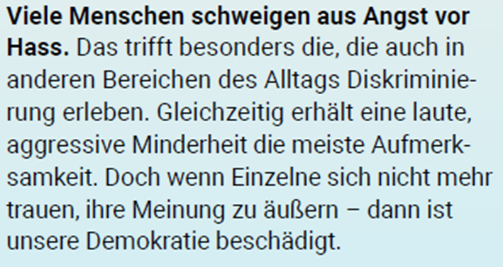 | Beleidigung, Hassrede, Nachstellung, Mobbing etc. | Menschenrechtsverletzung, Bedrohung für „unsere Demokratie“ |