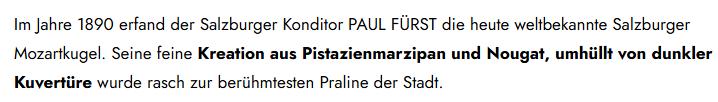 Plagiatsjäger können sich nicht um alles kümmern. Aber ich habe es dem befreundeten Salzburger Historiker Gerhard Ammerer zu verdanken, dass ich es genau wissen wollte, ob es vor der angeblichen Erfindung der weltbekannten Salzburger Mozartkugel durch den Konditormeister Paul Fürst 1890 schon Mozartkugeln eines anderen Konditors in Salzburg gab. Und siehe da, man entdeckt mit wenigen Klicks in der Google Buchsuche Unglaubliches: