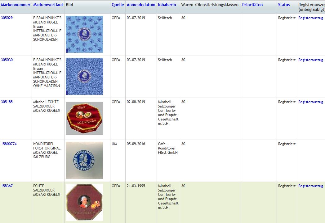 2. Es ist richtig, dass der Begriff „Mozartkugel“ solitär (alleinstehend) nicht geschützt ist, aber er tritt alleine in der österreichischen Markensuche in einer Vielzahl von Firmenvarianten auf, siehe Bild. Ich würde daher sagen: „Mozartkugeln“ oder gar „Echte Mozartkugeln“ dürfte ich eine neue Kreation nicht nennen, „Webers Mozartkugeln“ aber schon. Da fällt mir ein, dass die großartige Bäckerei Wippler in Dresden tatsächlich Weberkugeln anbietet: https://www.baeckerei-wippler.de/webers-freikugeln Diese dürften wiederum produkttechnisch ein kleines „Ideenplagiat“ der Salzburger Kreation sein… ;-)!