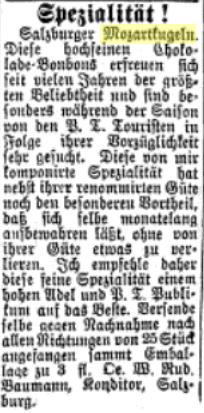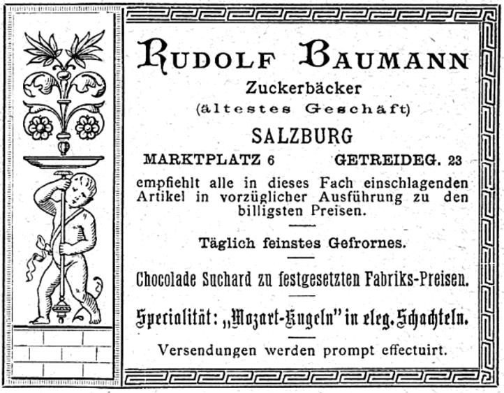 Konditor Rudolf Baumann annoncierte 1881, dass sich seine „Salzburger Mozartkugeln“ „seit vielen Jahren der größten Beliebtheit“ erfreuen und eine „von mir komponirte Spezialität“ seien. Es müsste sie demnach schon viele Jahre vor 1881 gegeben haben. Das hieße aber, dass sie Paul Fürst nicht erst 1890 erfunden haben kann.