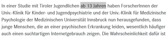 Die erwähnte Studie stammt aus dem Jahr 2018, das ist also schon mal eine Pseudo-Aktualisierung. Alleine das ist im Journalismus grenzwertig. Viel dramatischer ist aber: In dieser Studie der Medizinischen Universität Innsbruck wurden Jugendliche ab 13 Jahren untersucht. Sie kann also für die Debatte um ein mögliches Social-Media-Verbot bis 12 oder 14 Jahre in keiner Weise herangezogen werden. Gegenstand war auch das gesamte Internet und nicht bloß Social Media: