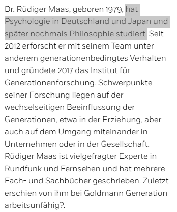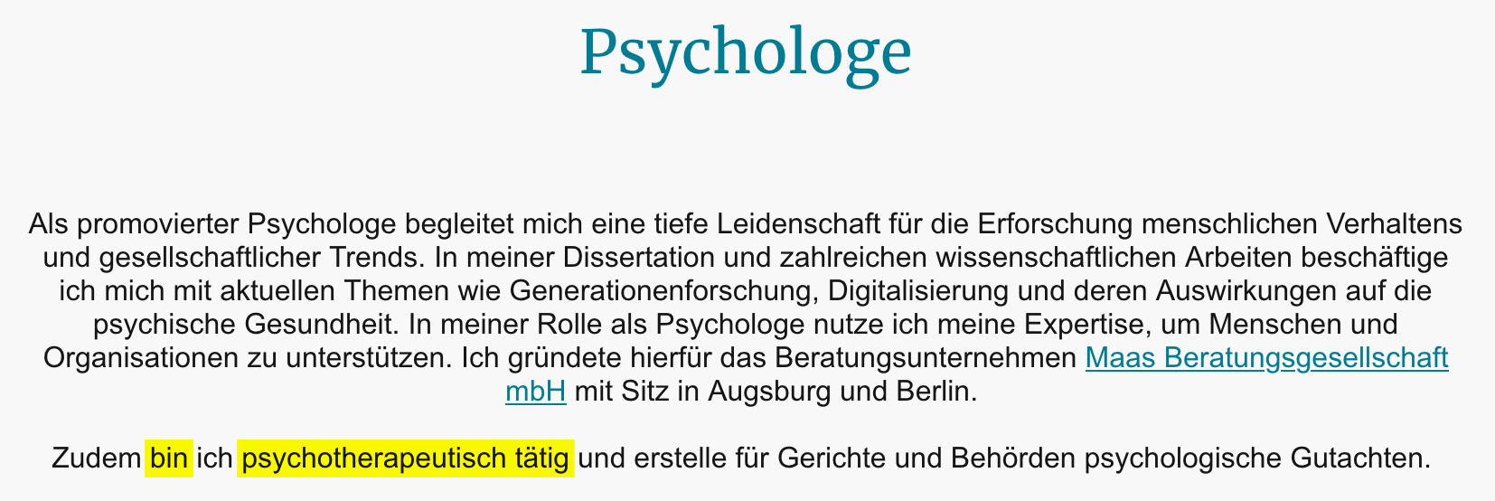 Seit mindestens Januar 2025 war auf der Website des bekannten „Generationenforschers“ zu lesen, er sei auch „psychotherapeutisch tätig“. Heute bestätigte die Psychotherapeutenkammer Bayerns schriftlich, dass Maas bei ihr kein Mitglied ist. Dieses müsste er aber nach § 61 Abs. 1 des bayerischen Heilberufe-Kammergesetzes sein, wenn er als Psychotherapeut in Augsburg tätig wäre. Eine eingeschränkte Bewilligung als Heilpraktiker schließe ich sachlogisch so gut wie aus.