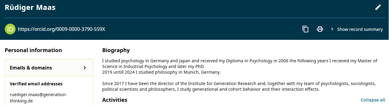Auch diese Schilderung des Studienwegs und der Studienorte stammt unzweifelhaft vom Autor selbst, denn sie fand sich bis gestern auch in seinem Forscherprofil auf ORCID (mittlerweile hat Maas auch diesen Text gelöscht):