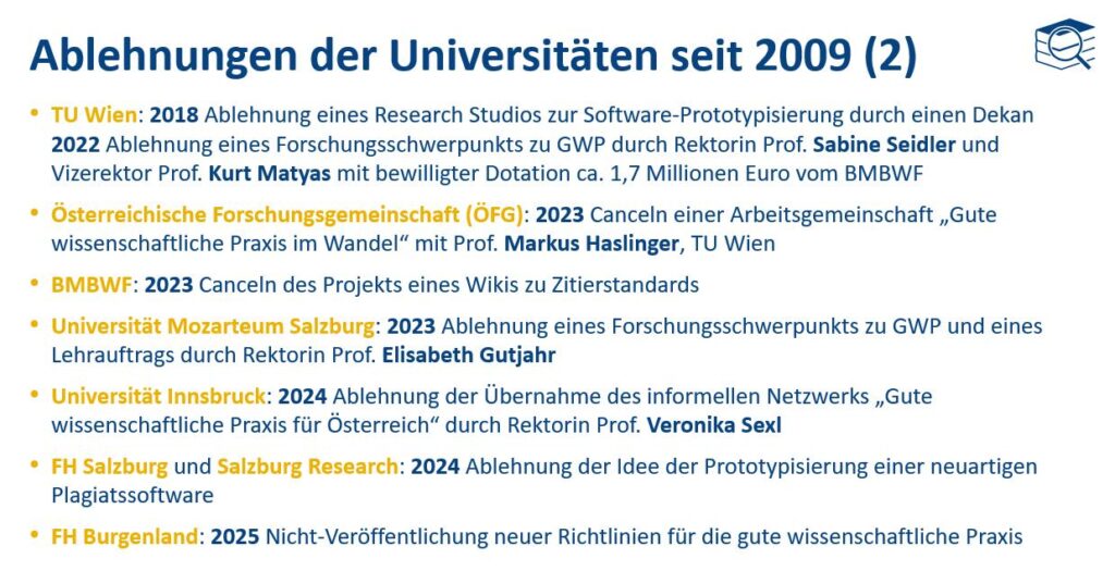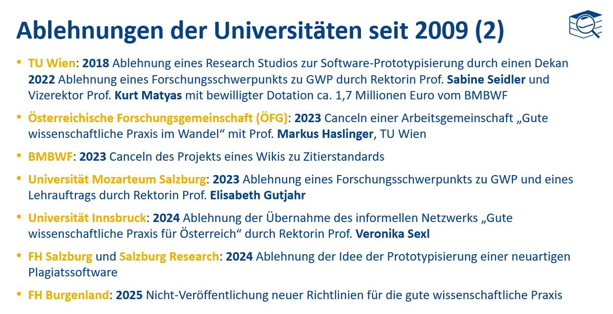 Die Universitäten machen all die wichtigen Vorhaben vom „Duden des Zitierens“ über das begonnene Zitier-Wiki und neue GWP-Richtlinien bis zur Prototypisierung von Software aber auch mit niemandem anderen: Sie machen es schlichtweg gar nicht. Bestes Beispiel ist die TU Wien, die durch völlige Untätigkeit in diesem Bereich glänzt, nachdem sie alle meine begonnenen Aktivitäten gecancelt hat.