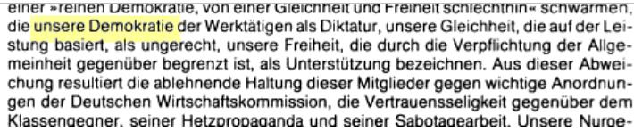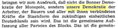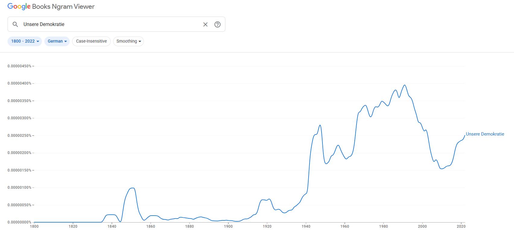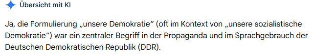 Eine Recherche mit Google Books zeigt schließlich, dass die Phrase „Unsere Demokratie“ als Schlagwort, als Bekenntnis gehäuft in marxistisch-kommunistischer Literatur der DDR zu finden ist. Die Rede war gerne von „unserer Demokratie der Werktätigen“ oder „unserer Demokratie der Arbeiter (und Bauern)“: